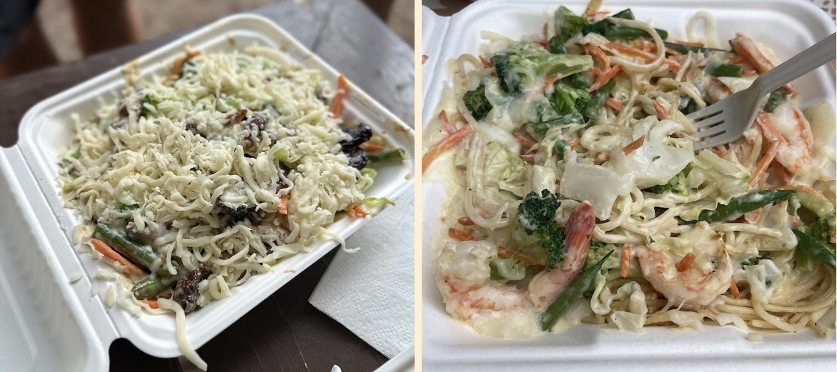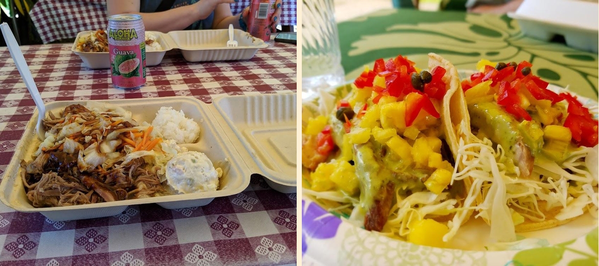 Try the famous pork ribs, chicken huli huli, and shrimp pasta. The Kalua tacos and macaron salad are local favorites. Pair your meal with classics like Pepsi or try their sauteed veggies as a side.